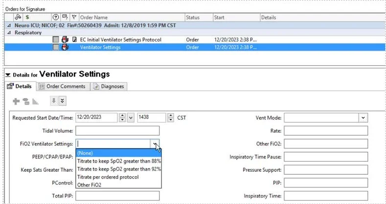 Due to a deficiency from DNV, the FiO2 OEF in the Ventilator Settings order and EC Initial Ventilator Settings Protocol order have been changed to a dropdown field. All other Ventilator orders remain unchanged.