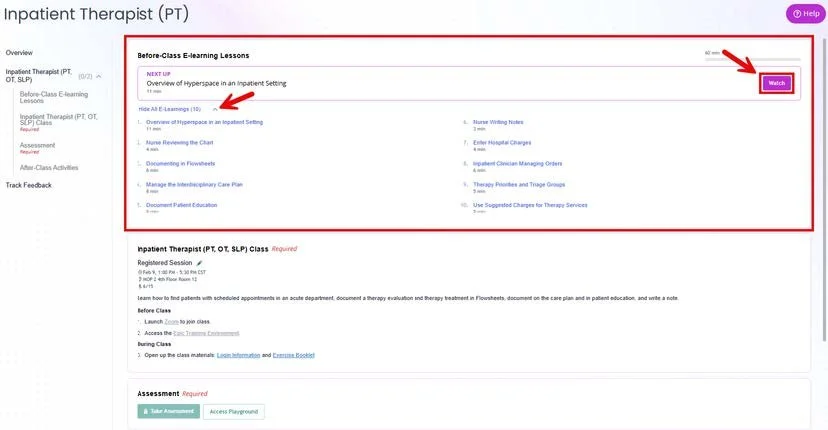 You can click ‘Show all E-Learnings’ to view all components. To get started, click ‘Watch’ in the top right corner. Remember, these must be completed before your in-person class.